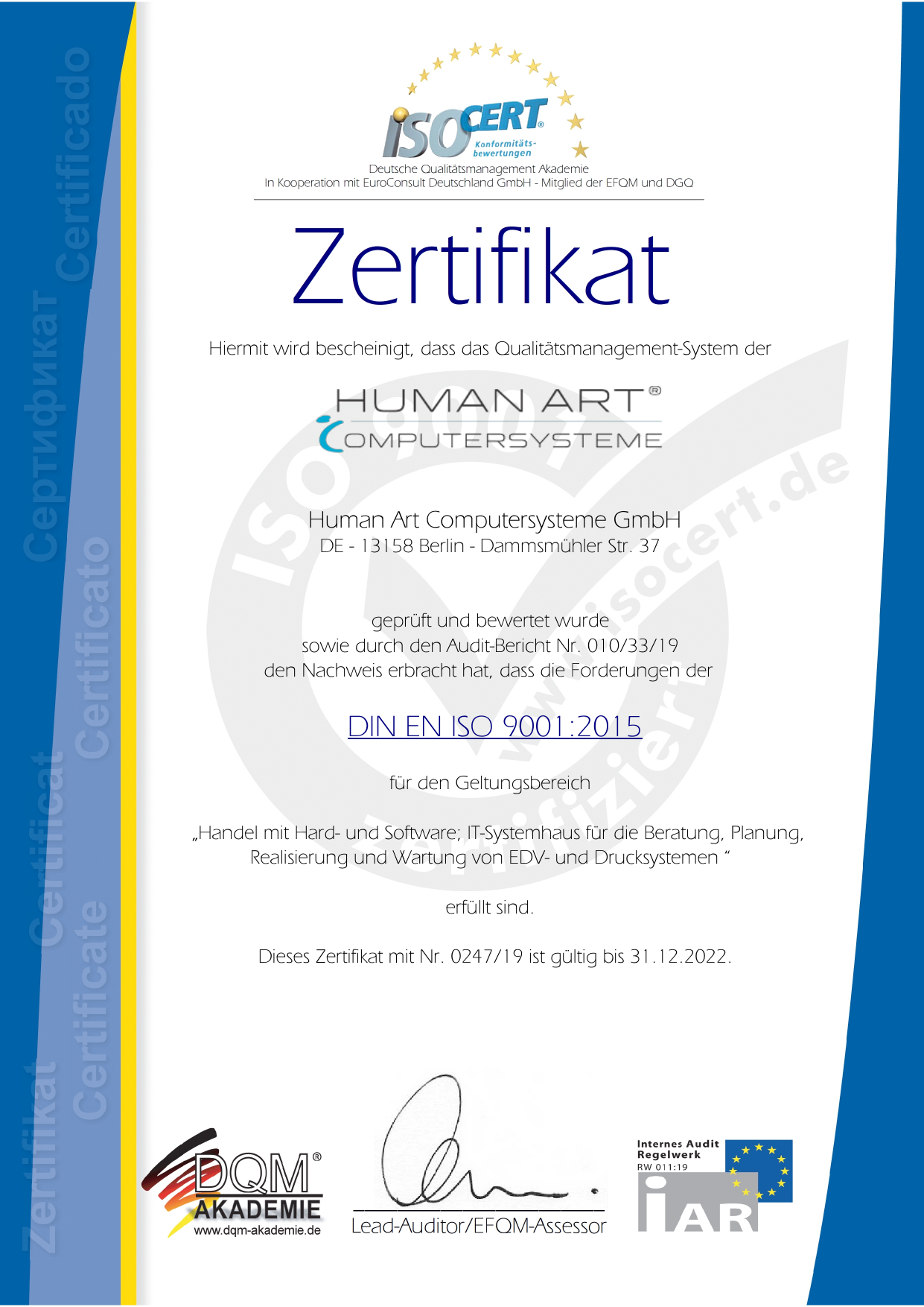 Die Human Art GmbH hat im Jahr 2007 ein Qualitätsmanagement aufgebaut und eingeführt. Im Juli 2007 folgte dann die Zertifizierung gemäß DIN EN ISO 9001:2000. Seitdem stellen wir uns jährlich unseren strengen Qualitätsvorgaben und lassen diese intern und extern überprüfen. Die Norm wurde in der Zwischenzeit zur ISO 9001:2008 erneuert und wir sind diesen Prozess mitgegangen. In diesem und dem kommenden Jahr steht eine erneute Revision zur ISO 9001:2015 an, diesen Weg wollen wir auch weiterhin verfolgen.